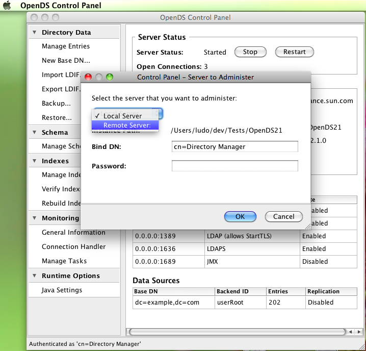 OpenDS Control Panel, connection dialogOpenDS Control Panel new connection dialog