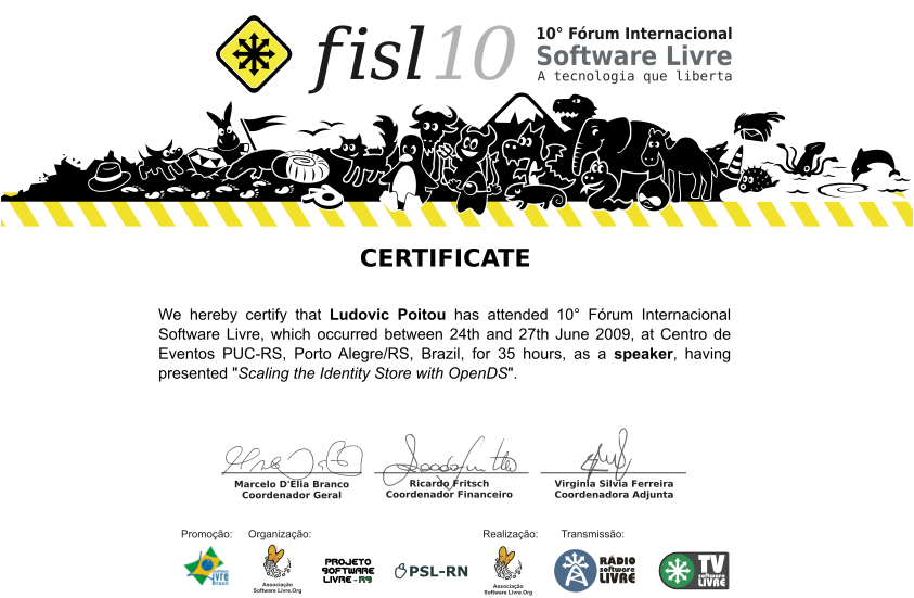I’ve just received a “certificate of attendance as a Speaker” from the FISL organizers. This is a very nice gesture and adds to the amazing experience that is FISL. Big thanks to the organizers and more specifically Fernanda Weiden who had to cope with the egos of over 320 speakers.